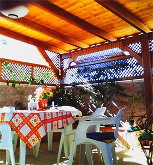 A terrace with a wooden porch, a double insulated roof, and a laundry room. On the terrace there is a table with a barbecue area, there is a wardrobe for storage.