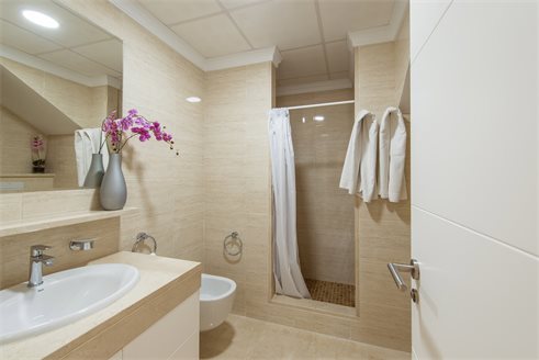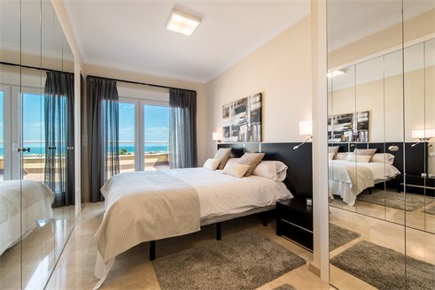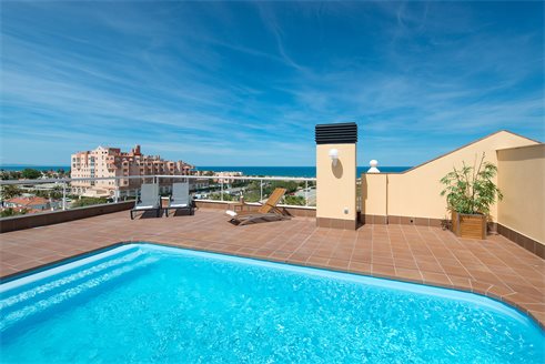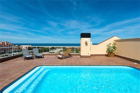 At a distance of less than 200 m from the beach, these apartments of the residence are a magnificient option if you would like to establish your residence in the Resort. It has a constructed area of 141.88 m2, distributed in living-dining room, kitchen, two bathrooms, three bedrooms, terrace and a magnificient roof terrace with 109,85 m2, private swimming pool and view on the entire resort. The apartment is equipped with air conditioning, parking space and storage room. Golf y Mar 6000 has a lift for all floors and large gardens with a communal swimming pool.