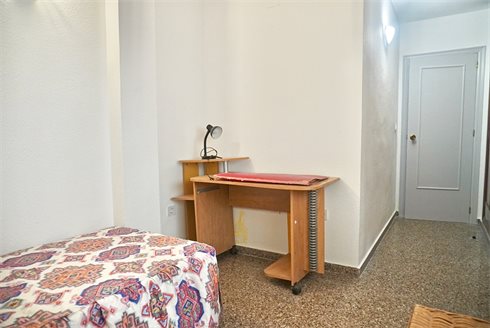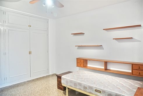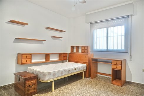 The second secondary bedroom of the apartment is at the end of the hall and is much larger than the previous bedroom. This bedroom has two single beds, several study furniture for children, fitted wardrobes with loft and window overlooking the backyard.