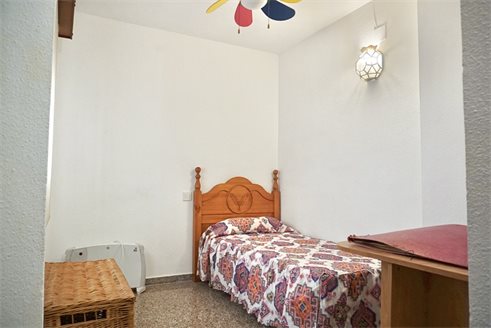 The first secondary bedroom of the apartment has a single bed, a desk, built-in wardrobe with loft and a window overlooking the backyard of the building.