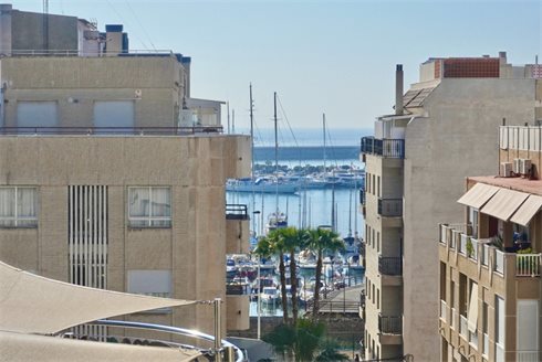 The large dining room of the apartment gives access to a long balcony from where you can see the sea in the port of Torrevieja.