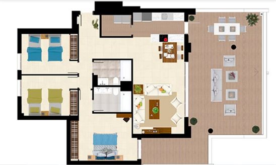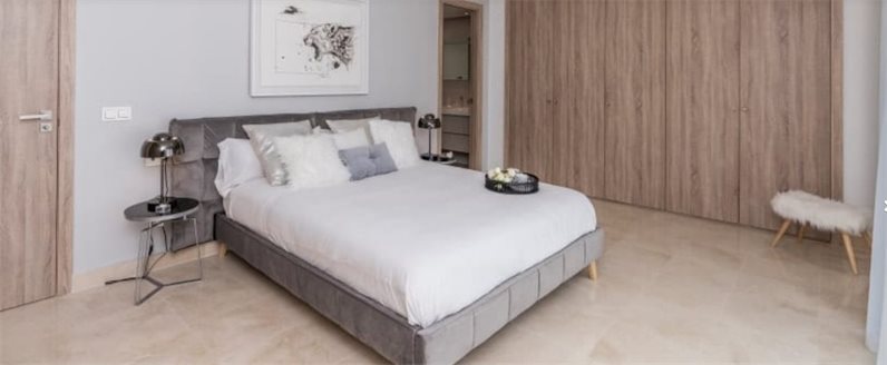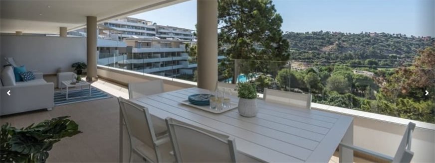 The modern layout integrates the living room with the dining room, the terrace and the trendy kitchen with high-end appliances. The fabulous apartment has 3 spacious bedrooms and 2 bathrooms with excellent sanitary facilities and underfloor heating. The 63 m² south facing terrace invites you to enjoy the breathtaking views of the sea towards the African coast and Gibraltar. Delivered fully equipped with high-quality modern finishes, it has a magnificent cream-colored marble throughout, panoramic doors to the terrace, LED lighting, air conditioning, etc. It comes with a garage space and a storage room