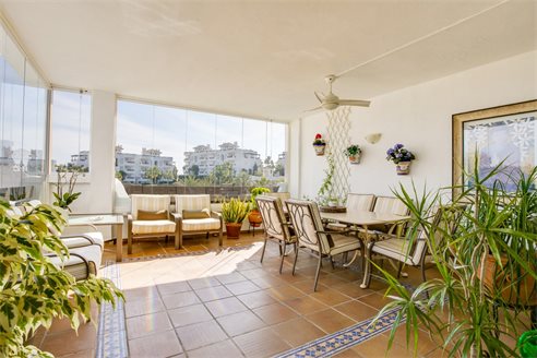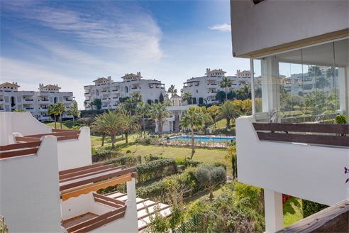 Fabulous south orientated apartment in the well known Selwo urbanization featuring 3 large bedrooms, 2 bathrooms, cream marble flooring, a fully fitted kitchen, double glazing, fitted wardrobes, , hot and cold air conditioning, laundry room and a large private and non-overlooked terrace with amazing panoramic views and new glass curtains.