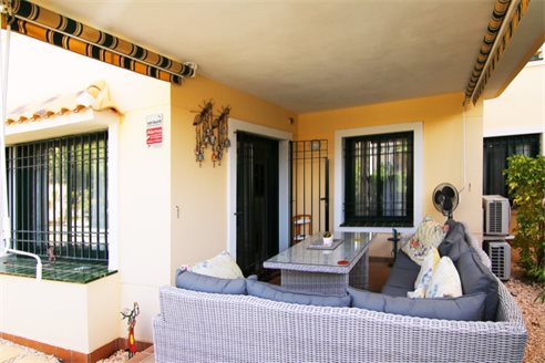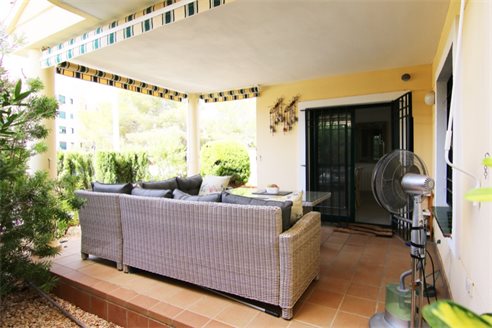 The property offers an open plan living and dining room, a generous open plan kitchen with utility room, two double bedrooms and a modern style bathroom with shower tray and guest toilet. From the living room there is access to the large covered terrace and the garden. The property is being sold semi-furnished and includes air conditioning and an assigned parking space, as well as a large communal pool. This magnificent light and airy ground floor apartment presents an ideal vacation home with great rental potential, ready to move into.