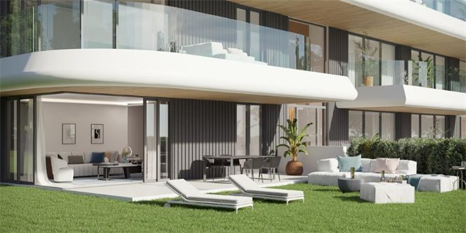 5 ground floor apartments with 2 bedrooms and 2 bathrooms, living area from 93.24 m2 to 104 m2, terraces from 21 m2 to 65 m2, private gardens ranging from 47.76 m2 to 167 m2. The price ranges from 415,000 euros to 640,000 euros.