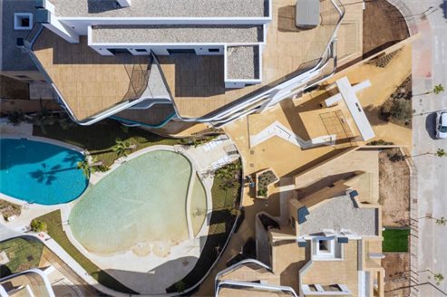 There are various types of apartments available to choose from 1, 2 and 3 bedrooms, single or double storeys and duplex penthouses with 3 or 4 bedrooms. The accommodations are characterized by their modern design and they consist of a living room, a kitchen equipped with appliances and a terrace. The penthouses have a large solarium and beautiful sea views.
