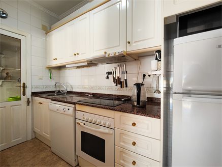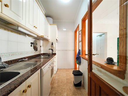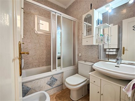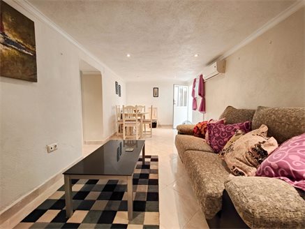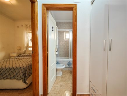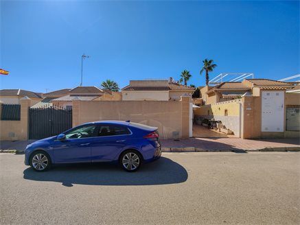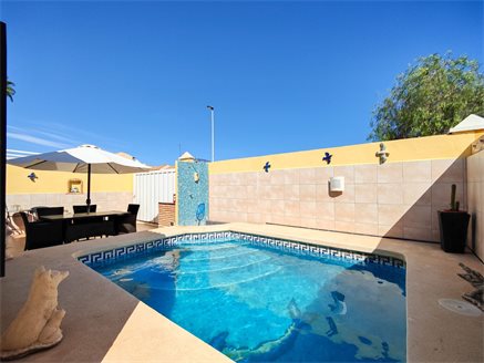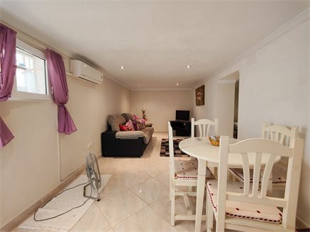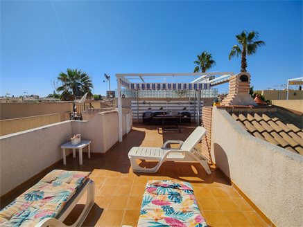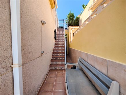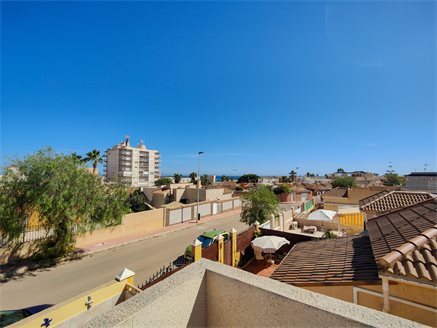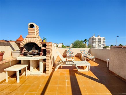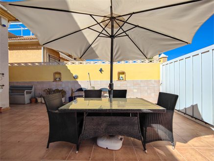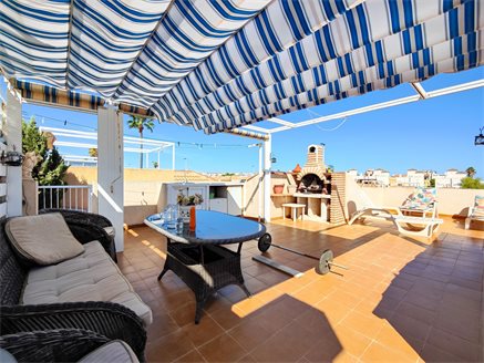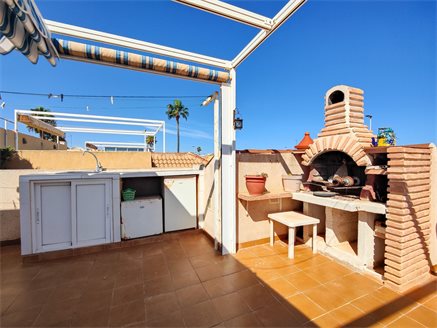 Stunning villa with private swimming pool and a large underbuild/guest apartment for sale in Villas Marinas, located in Los Frutales, just 300m from the sea front and the "Cala de la Higuera" beach, and a 15 min walk from the Playa de los Locos beach. All possible facilities such as supermarkets, bars, restaurants, pharmacy etc. are within walking distance. This house stands on a 132m2 plot with a lovely private swimming pool, off road parking for the car and a large roof terrace with barbecue and sea views. The roof terrace is fantastically equipped with various seating areas, barbecue, sun blinds. This beautiful mediterranean villa offers 2 bedrooms (currently one of them has been opened up but can be turned back into a bedroom), 1 bathroom, a spacious living room with dining area and a semi-open kitchen with access to a small laundry/storage room. The living room is equipped with aire conditioning. To the side of the property you can find the stairs that lead to a legalized underbuild which offers a spacious living room with a dining corner, 2 bedrooms and 1 full bathroom. Equipped with airconditioning in the living room. The property is sold fully furnished and equipped, ready to move in! Do not miss the chance to buy this beautiful villa with private swimming pool just a short walk from the beaches in Torrevieja!
