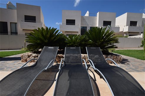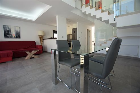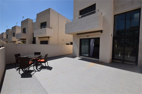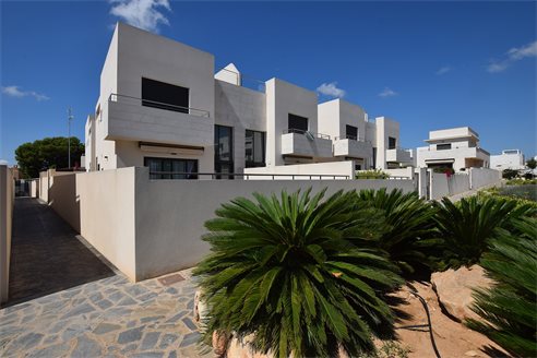 . Modern 3-level townhouse in a gated urbanization in the south of the province of Alicante, in the area of Orihuela Costa, Los Dolses. The townhouse was built in 2013. Good condition, sold with furniture and household appliances! Townhouse with its own plot, with a large solarium on the roof (60 m2) and a garage in the underground parking. The area of the house is 122 m2, 3 bedrooms, 2 bathrooms. On the ground floor: lounge-living room with access to the terrace, 1 bedroom, bathroom and storage room. On the second floor: 2 bedrooms (both with terraces) and 1 bathroom. On the third floor there is a large outdoor solarium terrace with views of the sea and surroundings.