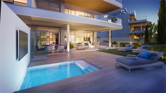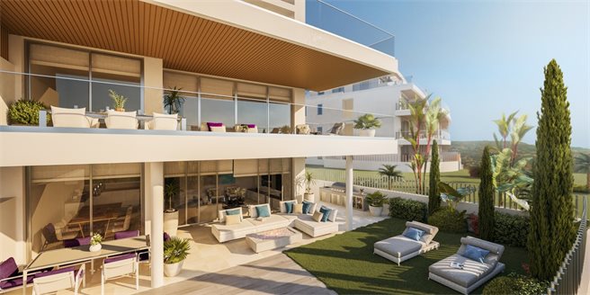 There are 8 apartments on the ground floor for sale: 3 bedrooms, 3 bathrooms, living area from 119.71 m2 to 145.67 m2, terrace area from 30.65 m2 to 58 m2, private gardens from 15.46 m2 to 29.48 m2. The price for a bungalow apartment is from 489,000 to 529,000 euros.