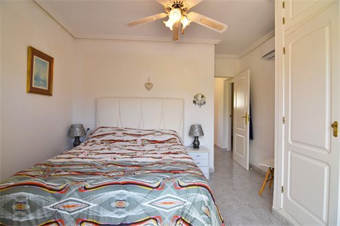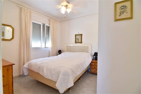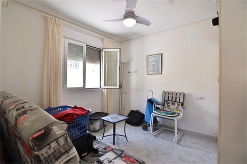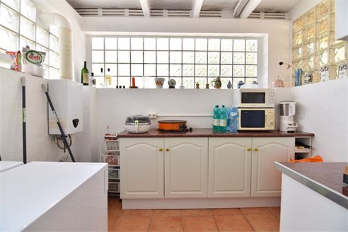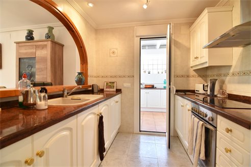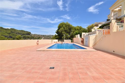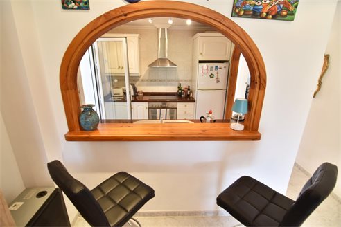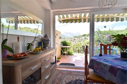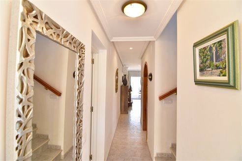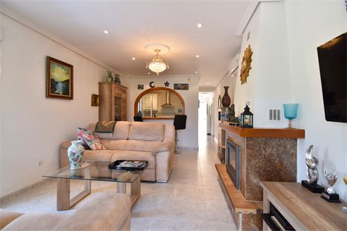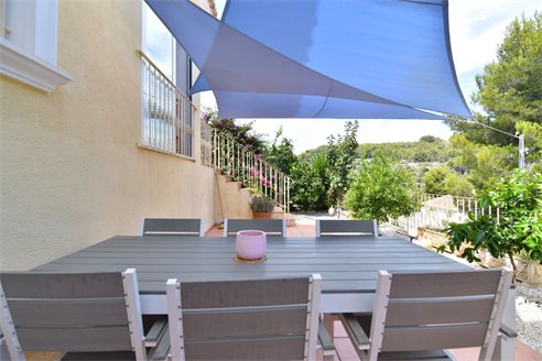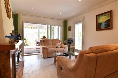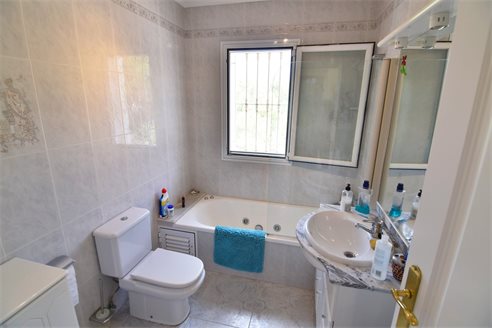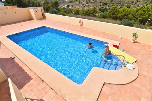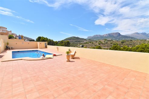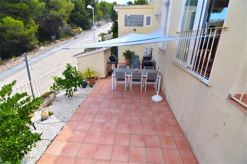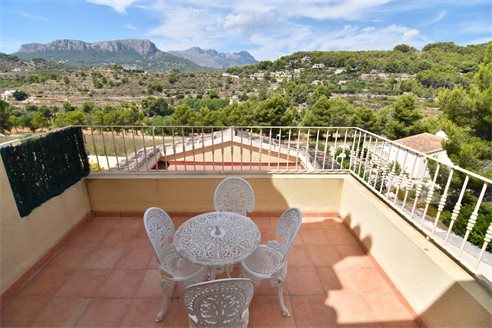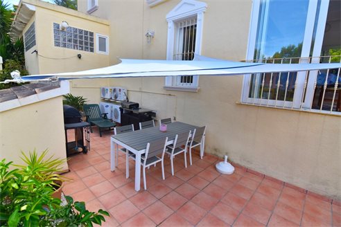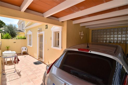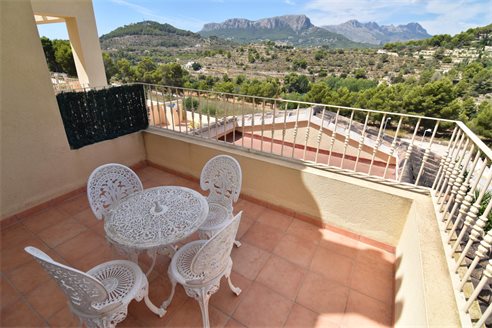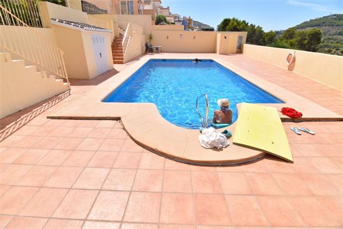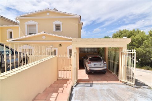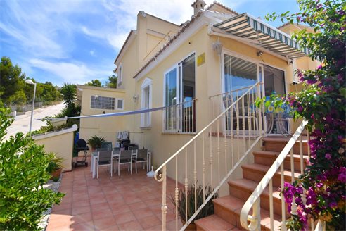 A 3 bedroom semi detached villa in Calpe, Costa Blanca, with communal pool and mountain views, 4 km from the beach. 99 sqm semi detached villa on a 150 sqm plot in Calpe, Costa Blanca, 4 km from the beach, 750 m from restaurants, 3.6 km from Mercadona, 4.7 km from Aldi and 3.8 km from Lidl supermarket. Alicante airport is 80 km away. The house is built on two floors, connected by an internal staircases: The lower floor consists of 1 living room with direct access to the pool area, 1 glazed terrace with mountain views, 1 fully equipped open kitchen, 1 bedroom, 1 laundry room and 1 bathroom with shower, sink and w.c. The upper floor consists of 2 bedrooms, 1 terrace with beautiful views and 1 bathroom with a bath, sink and w.c. Outside, the bungalow has a communal pool, parking and carport for 1 car, 2 terraces with open views and a beautiful garden with fruit trees. There is a 50 sqm basement currently used as a storage room.