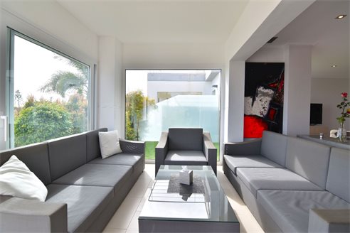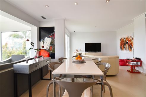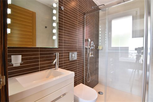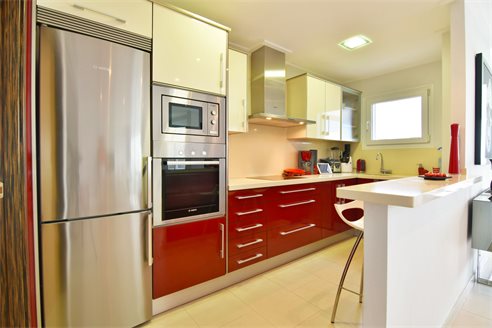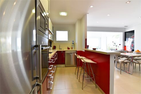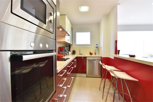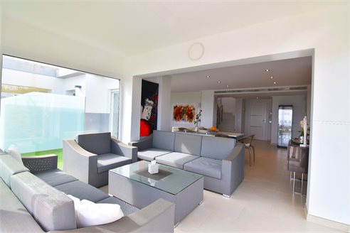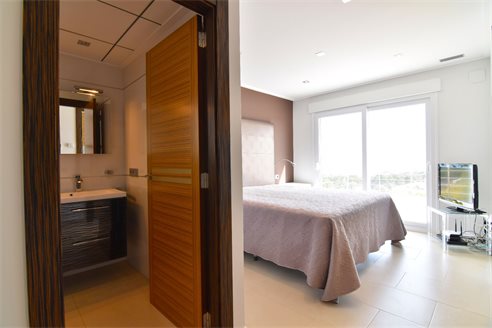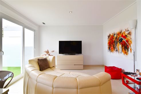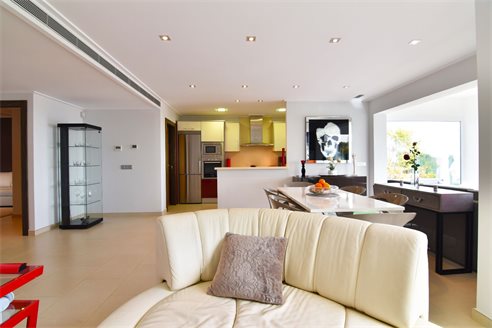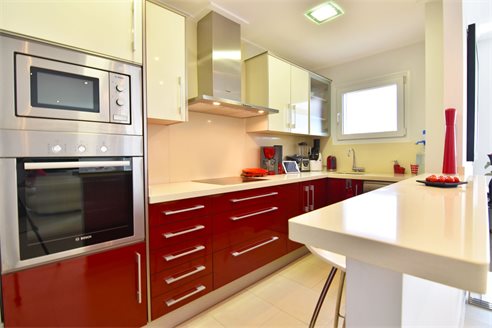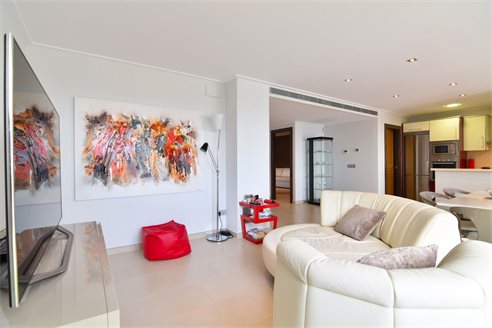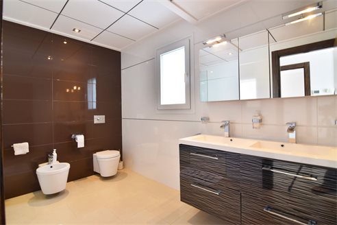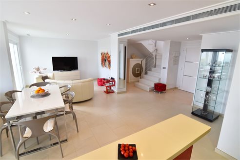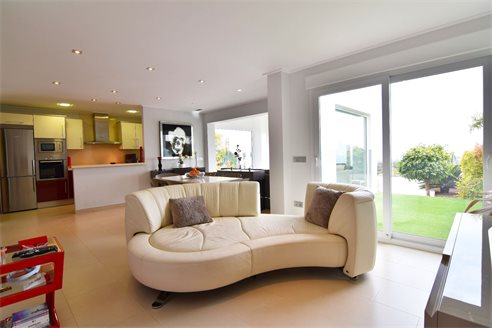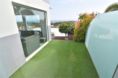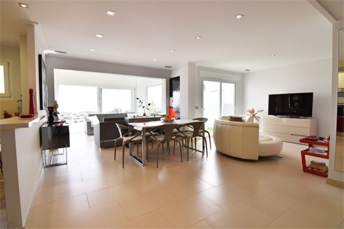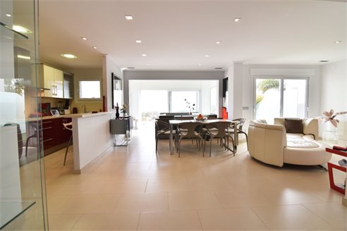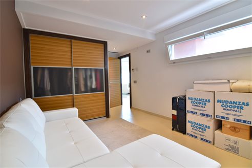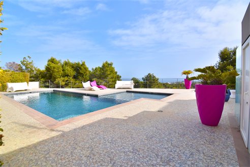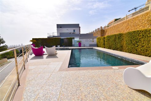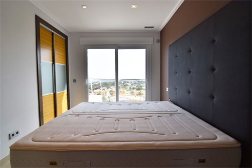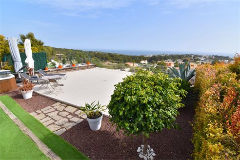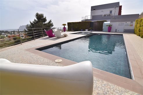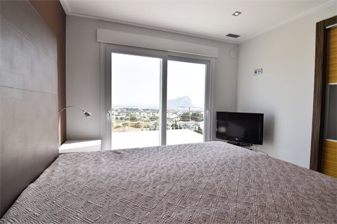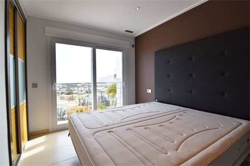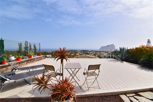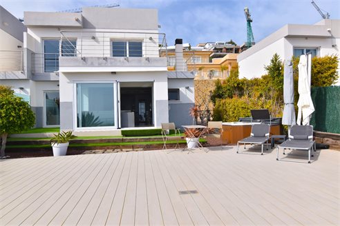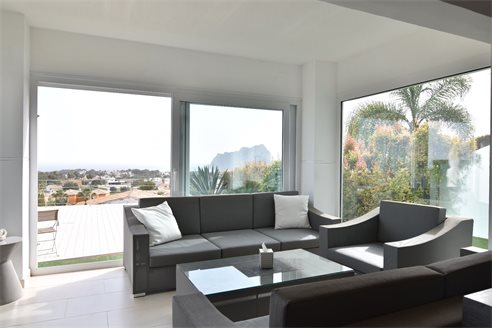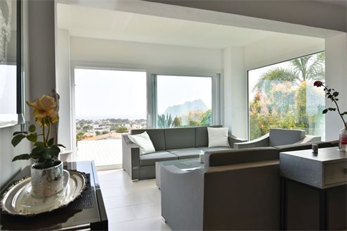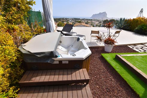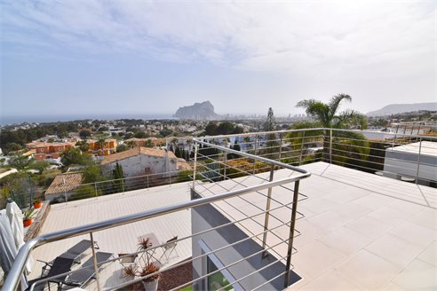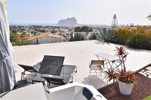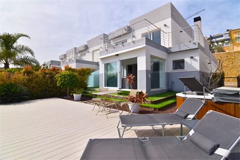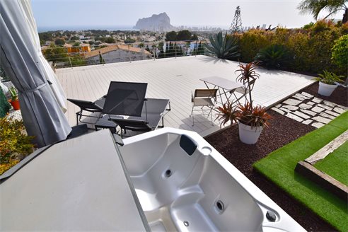 A 3 bedroom semi-detached in Calpe, with communal pool and beautiful sea views, just 1.5 km from the beach. This 150 sqm + 20 sqm (solarium terrace) modern style semi-detached villa is located in a quiet and sunny urbanization, just 3 km from the emblematic beach of La Fustera, restaurants and supermarkets. It is built on 2 floors, connected by an internal staircases: The first floor is distributed in 1 living-dining room with direct access to 1 fully equipped open kitchen and to the open terrace with fantastic sea views. 1 bedroom, 1 Laundry room, 1 bathroom with shower, sink and w.c. The second floor is composed of 2 bedroom with 2 bathrooms en-suite with shower, sink and w.c. and fantastic Mediterranean views. The house is equipped with mosquito nets, security alarm, central floor heating and central air conditioning. Outside, the semi-detached villa has a private jacuzzi, 80 sqm garage, communal pool and beautiful garden areas.