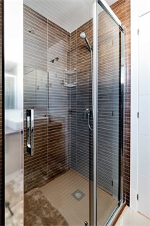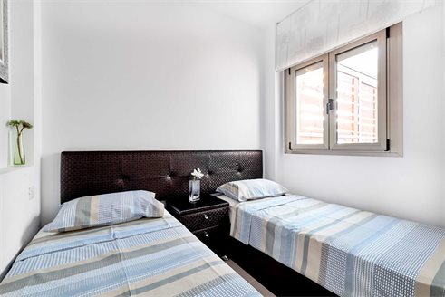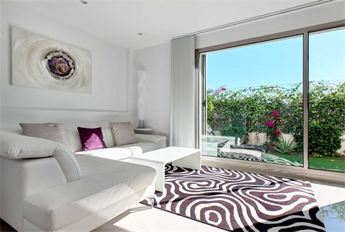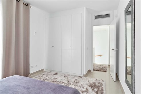 The ground floor consists of a spacious and bright living-dining room with access to the sunny garden, a fully equipped open plan kitchen with quartz worktop, a modern bathroom with shower and a large bedroom with fitted wardrobes. From the living room there is access to the 1st floor where we find the master bedroom and a guest bedroom, both with fitted wardrobes and 2 complete bathrooms (one of them being the en-suite of the master bedroom). The master bedroom also enjoys a terrace with sea views. The property is sold furnished and includes fully installed ducted A/C, alarm, underfloor heating, motorized blinds, custom made bathroom furniture, automatic awnings, garage space and storage room.