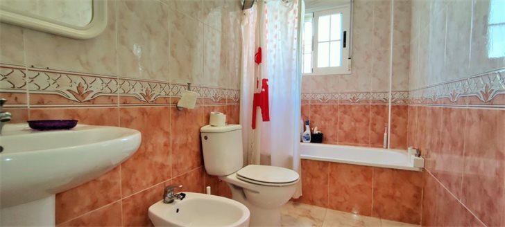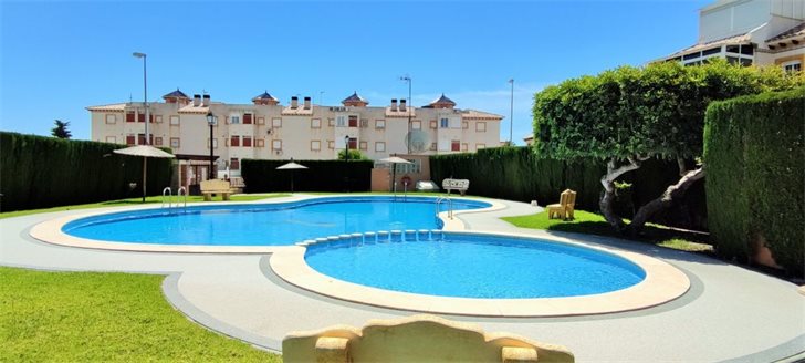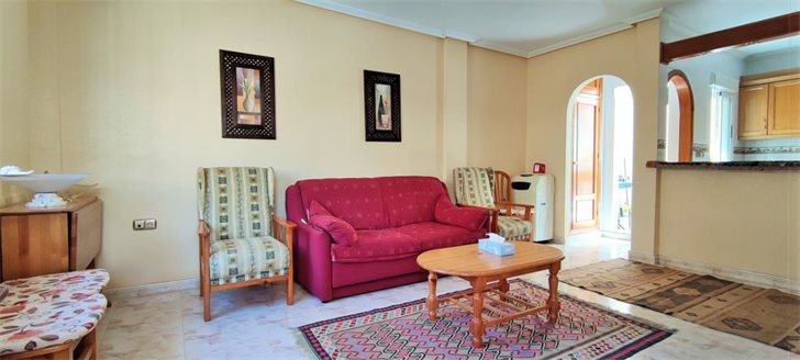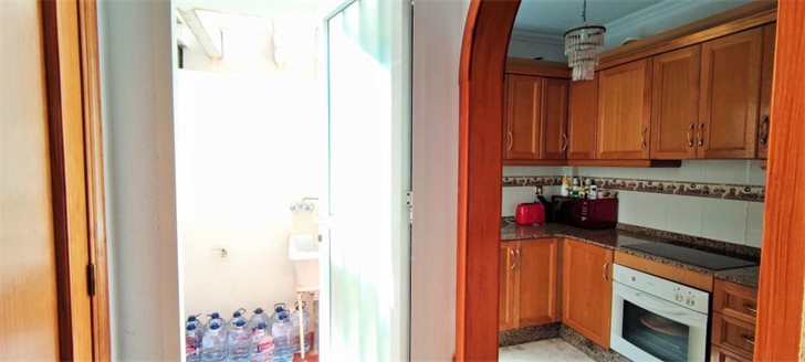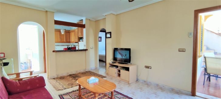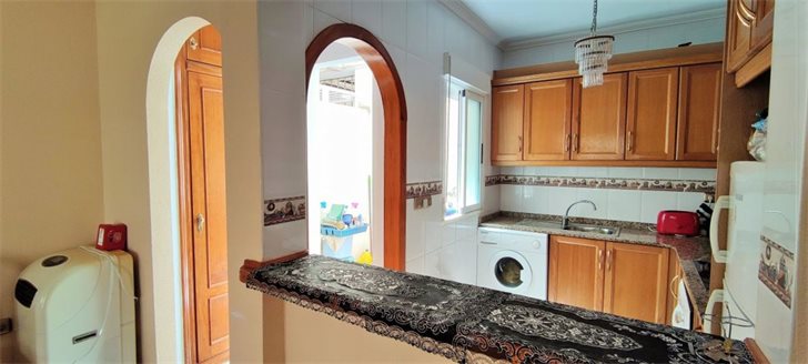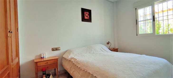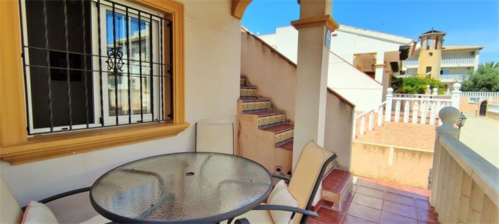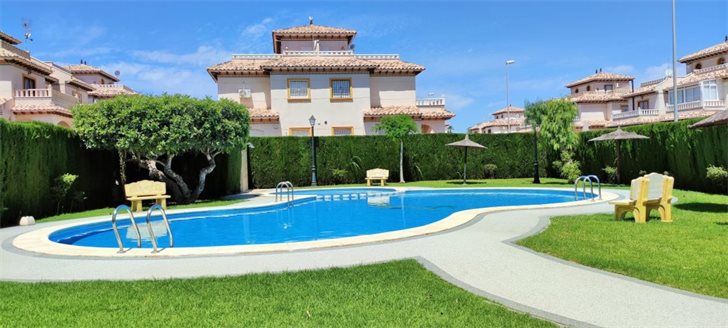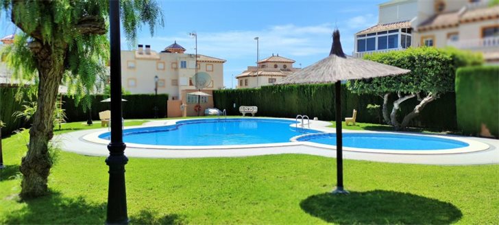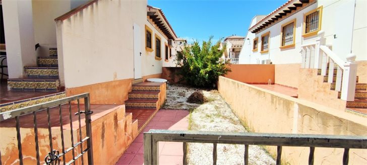 This is a well maintained 2 bedroom, 1 bathroom townhouse that is for sale furnished and ready to move into. The living room has good size lounge with a separate fully equipped kitchen and laundry room, large bathroom, 2 bedrooms with fitted wardrobes. Double gates allow easy access for off-road parking and there is a storage room under the stairs as well as the house has a fantastic private roof terrace perfect with sun all day. Located in a community with a beautiful communal pool area with large green area to enjoy Spanish sunshine and relax. Easy maintenance, walking distance to local amenities, commercial centre with lots of new bars and restaurants, supermarkets in Iceland, bus stop, etc.