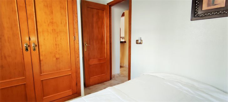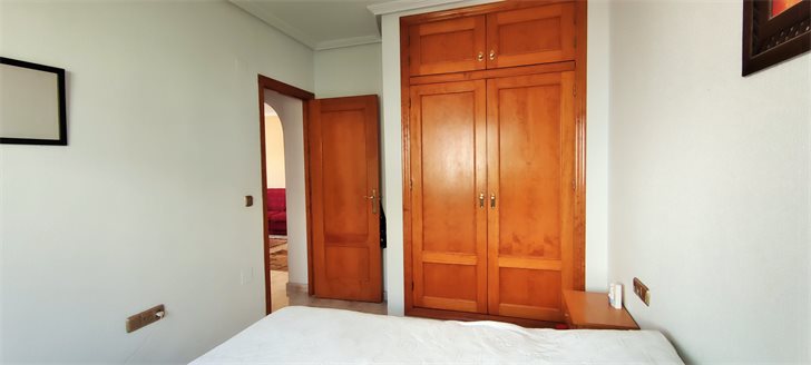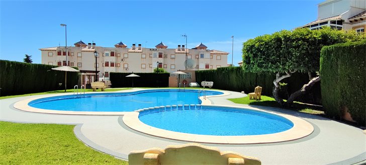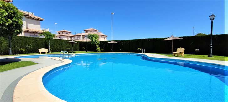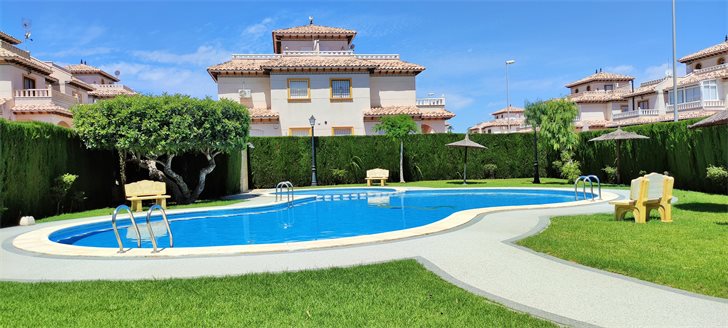 This is a well maintained 2 bedroom, 1 bathroom townhouse that is for sale furnished and ready to move into. The living room has good size lounge with a separate fully equipped kitchen and laundry room, large bathroom, 2 bedrooms with fitted wardrobes. Double gates allow easy access for off-road parking and there is a storage room under the stairs as well as the house has a fantastic private roof terrace perfect with sun all day. Located in a community with a beautiful communal pool area with large green area to enjoy Spanish sunshine and relax. Easy maintenance, walking distance to local amenities, commercial centre with lots of new bars and restaurants, supermarkets in Iceland, bus stop, etc .
