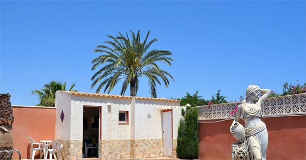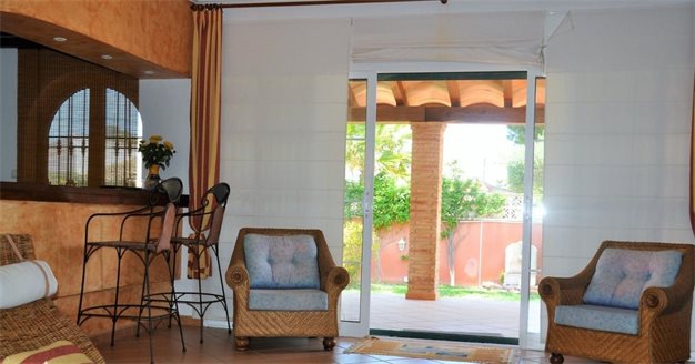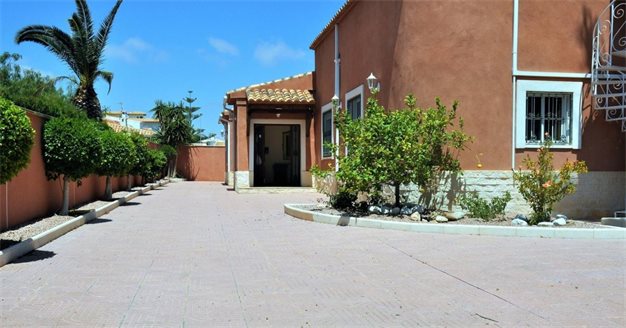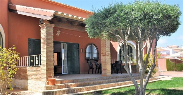 Nice independent Mediterranean style villa in Zenia Playa. The house has 4 bedrooms and 3 bathrooms. The property measures 241 m2 of house with 900 m2 of plot. The house has a private pool. The chalet has a sauna among its facilities. The villa is all on the ground floor with a solarium at the top. Very spacious living room with fireplace with bar area inside the house. Central heating and air conditioning. Large south-facing porch with a plot of natural grass and a garden. Possibility of putting 4 cars on the plot plus a closed garage and automatic entrance door.