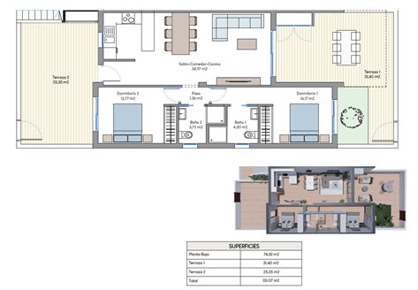The complex consists of a combined one or two-level townhouses. This apartment located on one level and has an area of 131 m2. There is a living room with dining room and open kitchen and with access to two large terraces. Two bedrooms, one of which has its own bathroom and dressing room. There is another bathroom in the hallway.