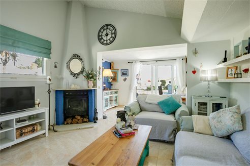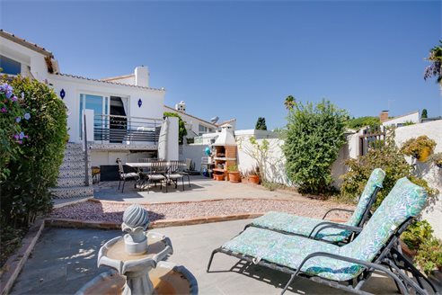 You then walk up about 6 stairs into the kitchen which is open plan to the living and dining. The living room has a nice wood burner for the colder months. From the dining area you walk out onto the terrace with sea views and then down into the spacious garden. The garden has a little gate taking you straight out across the green onto the paseo and then to the beach. The property also has an under build which can be extended with access from inside the house to create 1 or 2 further bedrooms and bathroom.