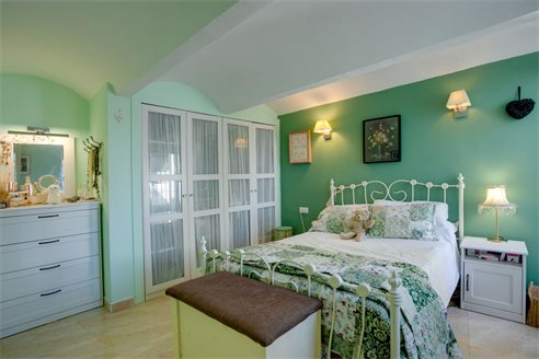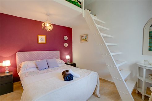 You enter the house and have two bedrooms and one bathroom, one of the bedrooms has access to the garden and the other has a mezzanine floor above the bed.