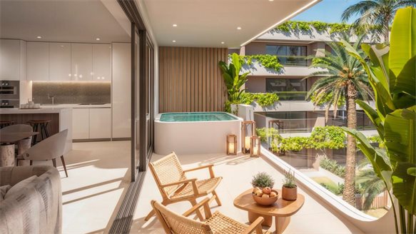 The project includes 101 apartments with one to four bedrooms, thoughtfully designed layouts, and spacious terraces. Prices start at €410,000, with penthouses with private pools starting at €695,000. Two-bedroom apartments are priced from €499,000, three-bedroom apartments from €565,000, and exclusive four-bedroom bungalows from €1,000,000. The complex is scheduled for completion in December 2027.