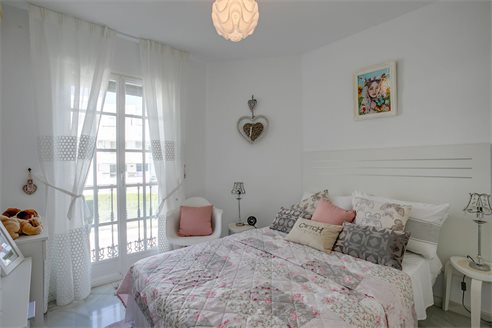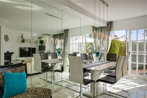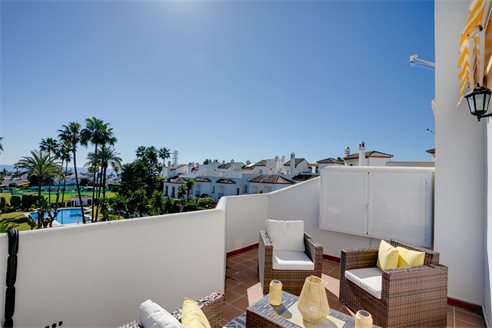 Lovely townhouse with 3 bedrooms and 2 bathrooms and guest toilet. There is a front garden where you enter into the house, a fully fitted kitchen which can be opened up should anyone require and living, dining room which opens onto the private garden and then into the communal garden with large swimming pool.