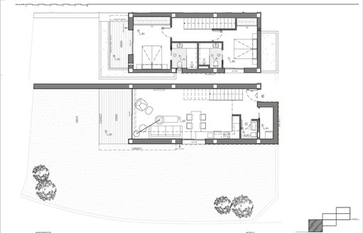 Modern apartments with 2 and 3 bedrooms and 2 bathrooms are available. The layouts are thoughtfully designed down to the last detail: the open kitchen opens into the living room, creating a spacious and bright living space. Depending on the type of home, options are available with spacious terraces, private gardens on the ground floors, or private rooftop solariums. All apartments feature open views, enhancing the feeling of oneness with nature and the sea.