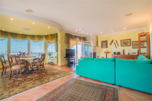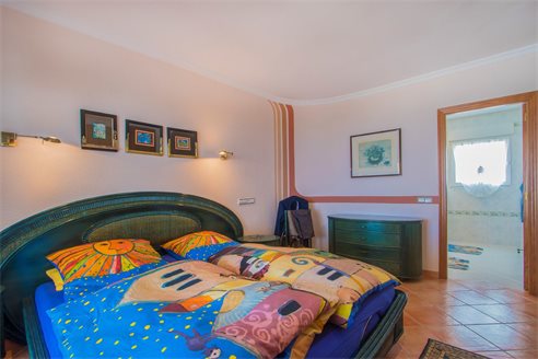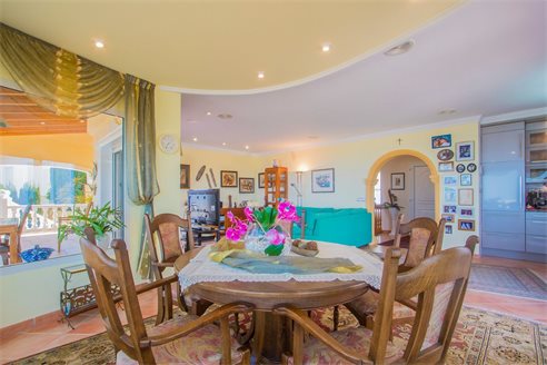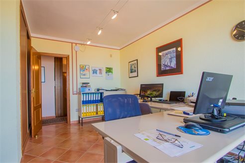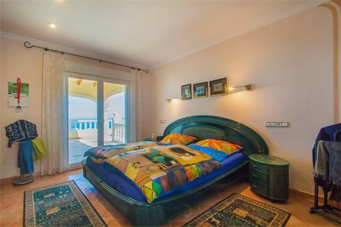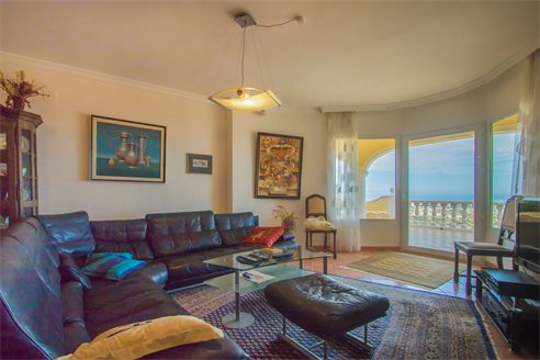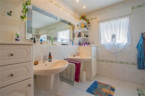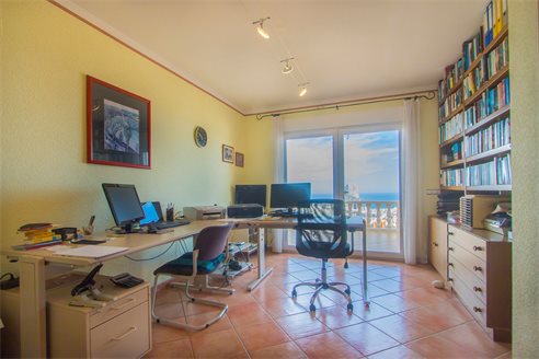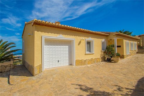 This 1998 villa was built on a plot of 1,024 sqm and is organized in two heights connected through a staircase. From the entrance to the plot until the main entrance of the house there are 6 steps to the main floor (upper floor): large living-dining room with big windows and an impressive view to the sea and Peñón de Ifach. In this living room there is a tiled stove which is heated with wood during the less cold winter days. It warms up the whole floor. From here access to the covered terrace. From all the rooms in this villa seaview. Besides on this floor: modern open kitchen equipped with microwave, oven, ceramic hob and refrigerator with freezer, pantry with washing machine. 1 guest-toilet, main bedroom with bathroom en suite (bathtub and shower) and with access to the terrace. Garage for one car with direct access to the kitchen. Open parking for approx 4-5 cars. Ground floor (access by internal staircase or from outside): 2 bedrooms (1 is used as an office) the other one has a bathroom en suite and access to the pool area, sauna, storeroom under the stairs, engine room with water depot of 800 litre getting heated by solar-system.