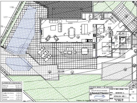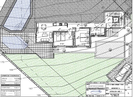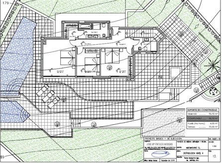 Going up with the elevator,you reach the ground floor of the main house with large living-dining room, an American kitchen and one bedroom with en-suite bathroom and a guest toilet. On the upper floor there are 3 more bedrooms and bathrooms. In addition, on the outside, there are several covered and uncovered terraces and 2 swimming pools.