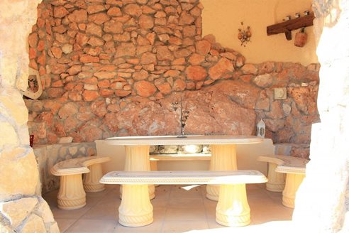 The pool of 5 x 11 m is surrounded by a terrace where there is a summer kitchen, a toilet, ashower and a romantic covered stone terrace. From here, external stairs lead to the lower part of the plot to the entrance and two large garages with electric doors.