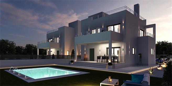 Exclusive residential location of 3 and 4 bedroom villas. Available in two versions: on semi-detached houses of 255m2, or townhouse of 280 m2. Inside the plot of each house there will be space for car parking and individual pool. All homes have two floors, plus the upper floor with solarium, which has incredible views of the sea and the bay of Santa Pola.