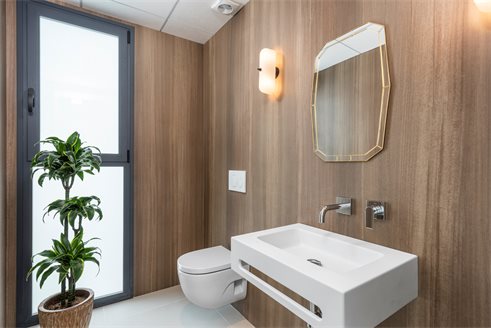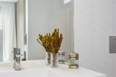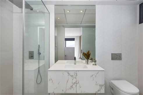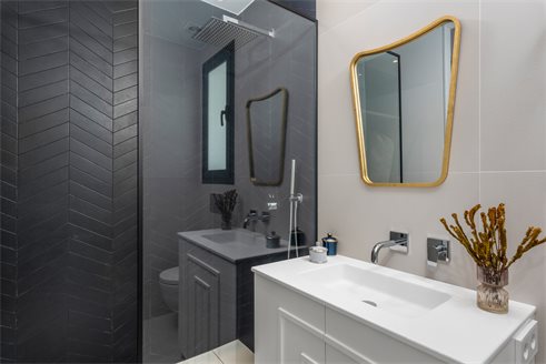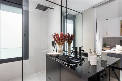 - Bathrooms-Furniture-Hanging toilets-Screens (crystal partition wall)-Mixer taps with a single lever.