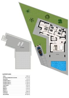 House with three bedrooms and 2 bathrooms with an area of 110 sq.m; The master bedroom has a built-in bathroom and a dressing room. Hall-dining room with open kitchen. All premises have access to the garden, where it is possible to build a swimming pool, and there is parking.
