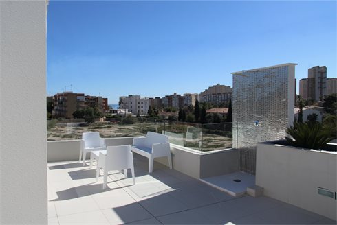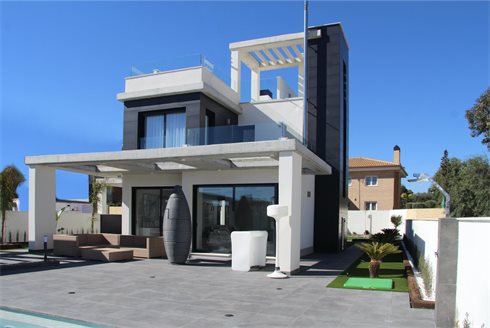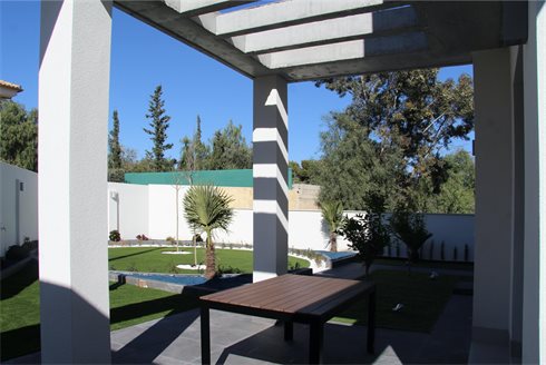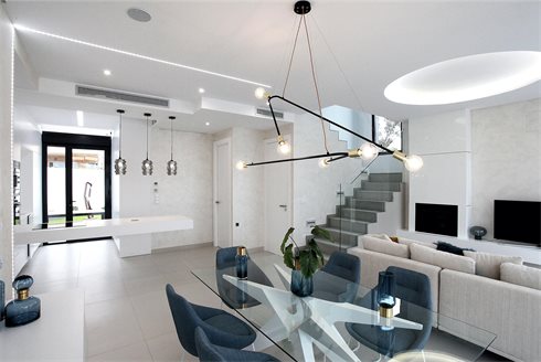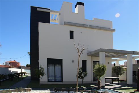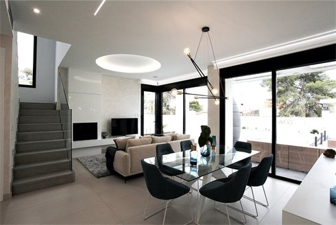 Modern villa in El Campello, located near the beach in the north of the Costa Blanca region. The villa includes a spacious living room with an open kitchen, 3 bedrooms, 3 bathrooms, a cozy terrace overlooking the garden and a private swimming pool. The house has a basement that can be converted into a gym, sauna, games room, home theater, or extra bedroom. Built on plots from 470 m2 to 485 m2.