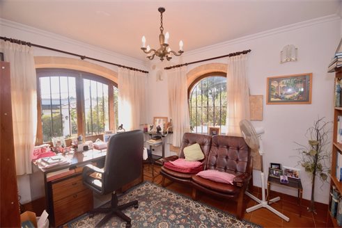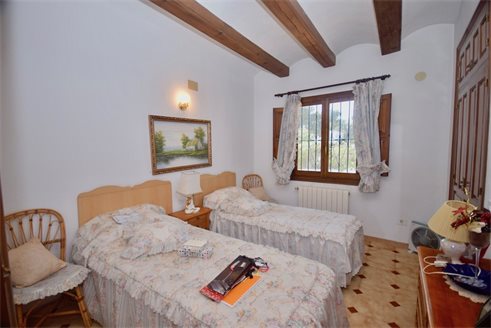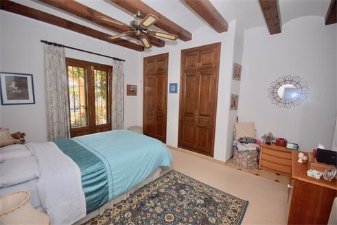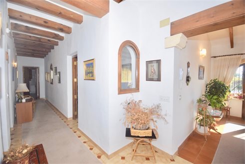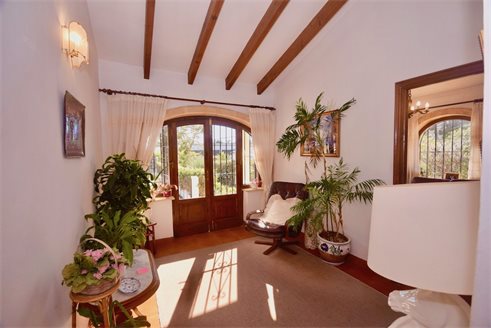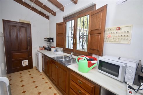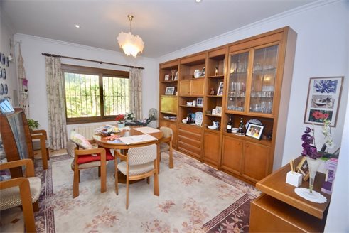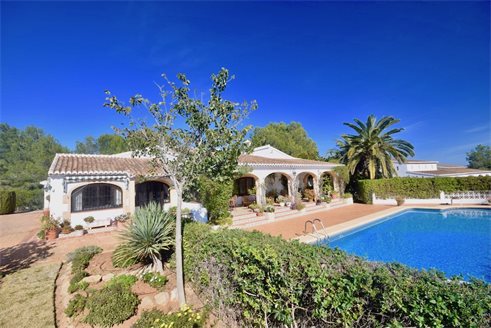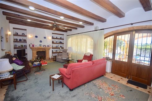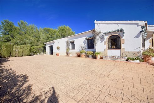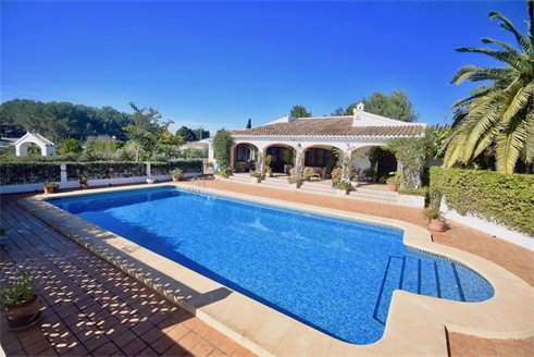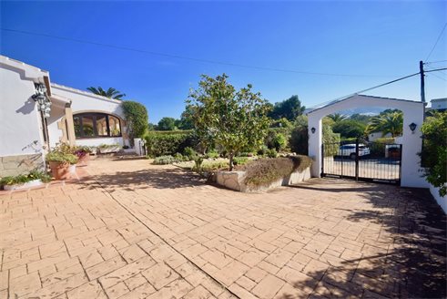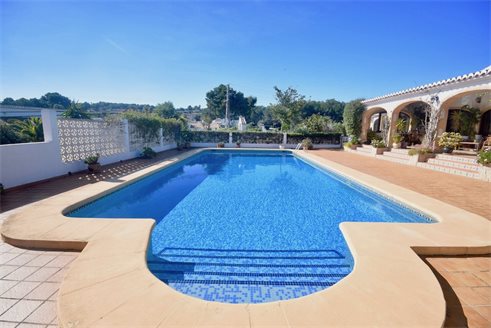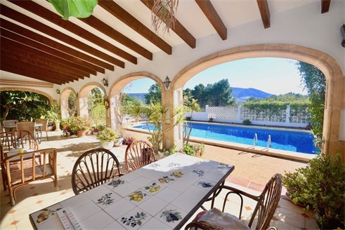 Built in 1992 and owned and occupied by one family since then, this spacious family home is set over one level and comprises 3 double bedrooms (incorporating built-in wardrobes), 3 fully-fitted bathrooms (2 en-suite), a generous-sized living room and separate study (which could be used as a small fourth bedroom). There is also a good-sized family kitchen with connected utility room and a separate dining room.Gas central heating is available throughout the property and a large hot water storage tank is also provided.The airy living room (with Tosca Stone decoration) and main bedroom lead out onto the pretty, spacious south-facing naya (covered terrace), perfect for relaxed al-fresco dining, with panoramic views up to Benitachell and the surrounding hills.The cool, shady terrace overlooks the larger-than-average fully-maintained private swimming pool (also incorporating Tosca decoration) and mature, landscaped, easily-maintained garden.Approached via double gates, the property is fully-enclosed and completely private. There is a detached large single garage, a separate single car port and ample driveway (as well as on-road) parking for guests.The property is conveniently located just five minutes’ drive from Benitachell town, while Javea and its family-friendly beaches are just over 10 minutes away by car. The popular Javea Golf Club is a couple of minutes by car, or a short walk away, and a highly-regarded international private school is within 10 minutes’ drive. The nearby pretty towns of Moraira and Teulada are also close by and road connections to Denia, Calpe, Valencia and Alicante (for the nearest airport) are all easily accessible.The property has been lovingly maintained by the family during their ownership and is immediately available for purchase. Offers in the region of 595,000€ will be considered, which recognises that the property could benefit from some modernisation.This is a rare chance to buy a very well-priced property in an exclusive residential location – early viewing is highly recommended!