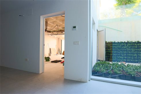 A spectacular internal staircase with glass panels and oakwood steps leads down into the under-build where an internal courtyard with a vertical garden provides natural lighting.
