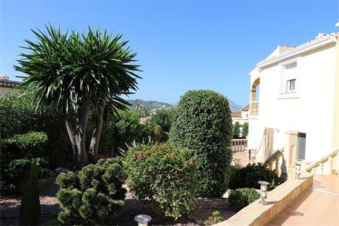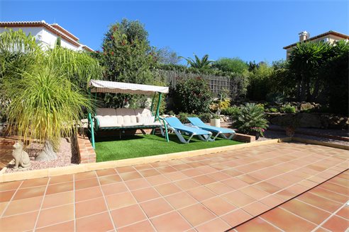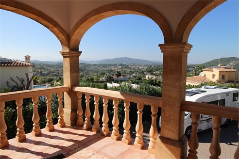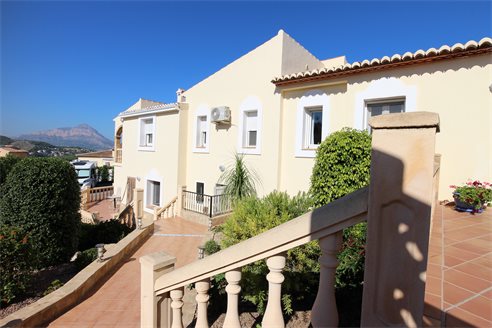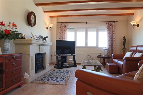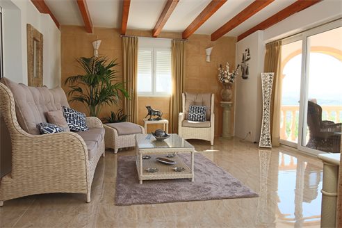 Informal lounge with two skylights and sliding glass patio doors leading to a covered terrace with open countryside views towards the Montgo mountain and a distant view to Javea Port.