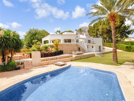 Three bedroom villa of unique design on a generous south facing plot, only minutes away from the idyllic Javea Old Town, with views of the sea and private pool with waterfall.