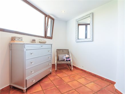 Through internal steps we reach the second level where there is a large bedroom with en-suite bathroom and access to the pool and the gardens.