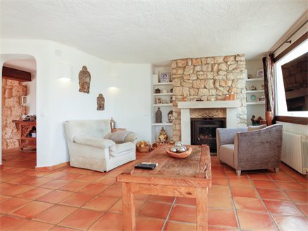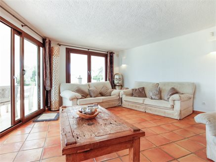 From the driveway the entry to the villa is through ornate front doors which open into a living room that features a wood burning stove and from which, through sliding glass doors, a wonderful naya, that goes around the house up to the kitchen door, can be accessed.