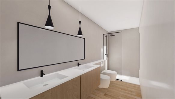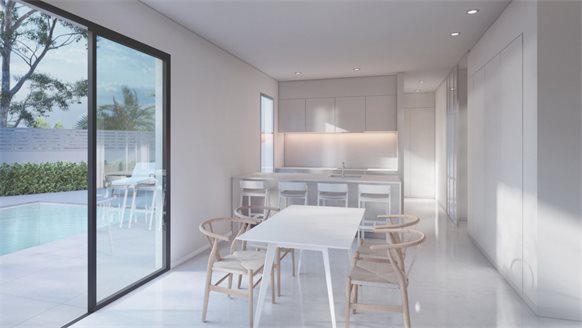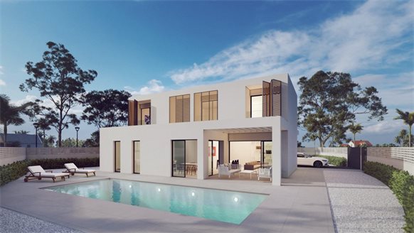 Distributed over two floors, this villa offers a spacious living room on the main floor, which is connected to the kitchen with cooking island the large sun terrace with private pool. Furthermore, here we find the master bedroom with built-in wardrobes, a bathroom, a storage / laundry room and the entrance hall with stairs that lead us to the top floor.