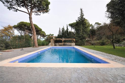 In the outdoor area we find a large pool with a barbecue area, surrounded by garden and forest.