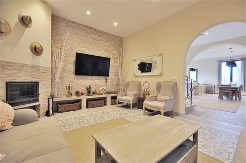 On the ground floor we find a cozy living room with a fireplace, a fantastic and spacious dining room with an integrated kitchen, a guest bathroom, an ironing room and a storage room.