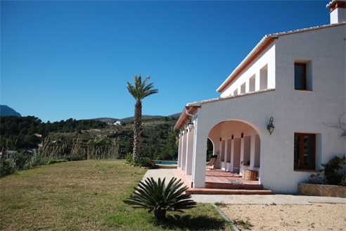 Villa for sale in Benissa Magnificent luxury villa in Benissa with Mediterranean charm, located in a very quiet urbanization and close to amenities, 2.5 km from Benissa. The house is located at the top of the plot, with an exclusive access to it and with exceptional views at the mountains and the sea. The property is in good condition, south facing andfull of light, it has 6 large bedrooms with built-in wardrobes all of solid wood, with en-suite bathrooms, also a guest bathroom, a large living room with fireplace, an independent and fully equipped kitchen and terraces, one glazed.  It should be noted that the bathrooms are fully equipped with sanitary pieces of marble, from Italia and of the brand Roca, the floor of the house is natural clay and brazilian stone, the windows and exterior doors are made of wood and there is double glazing throughout the house. To offer greater comfort the property has a gym, jacuzzi, solarium, a room of leisure, a laundry and storage room. In addition, outside you can enjoy a large garden with irrigation system, barbecue area and a private pool of 9x5 meters.