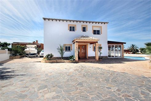 At 1000 meters from the Levante beach we find this pleasant house offering 340-degree views of the mountains, the sea and beyond. It is conveniently accessed by walking to the beach and its promenade where there are supermarkets and restaurants. It was built in the year 1980 having been completely renovated recently. Flat plot of 740 m2 with ample parking space. The house has two floors. GROUND FLOOR: entrance hall, kitchen, 2 bedrooms, 1 bathroom with shower, spacious living room with access to a nice glazed terrace and the pool area with terrace, interior stairs lead to the HIGH FLOOR where there are 3 bedrooms each with its ensuite bathroom (3) and an office, also from this floor the views are fabulous towards the mountains, sea and much more.