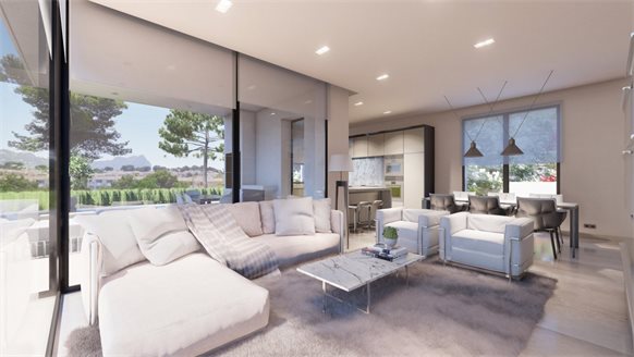 On the right area we get access to the daily area, where we can find the kitchen completely open to the dining room and living room, from where you can directly access to the terrace.