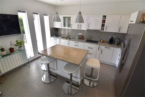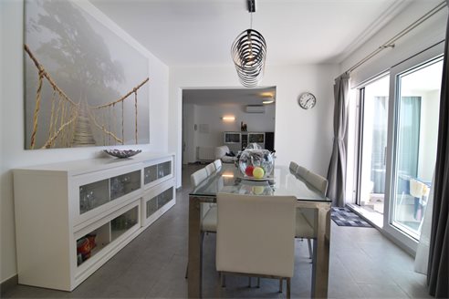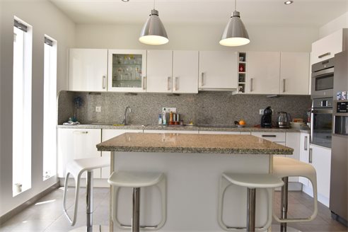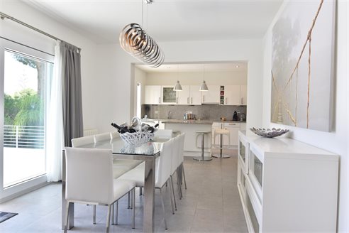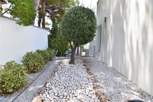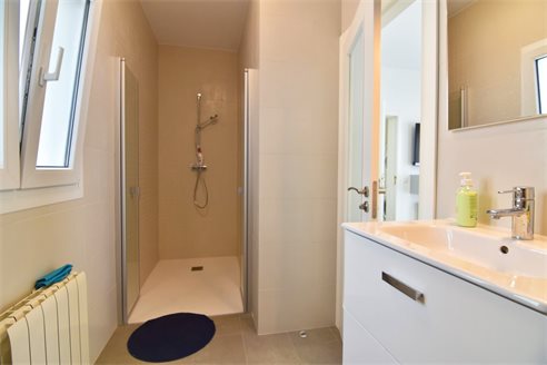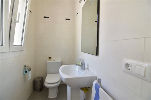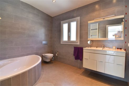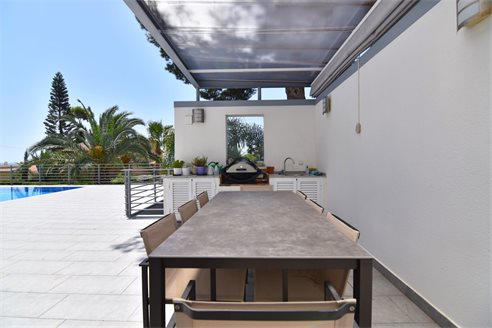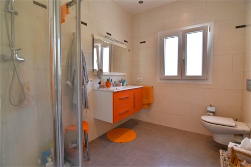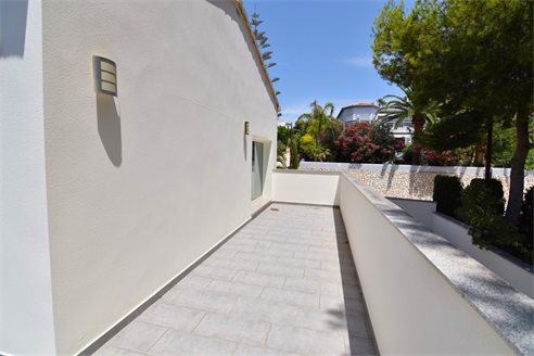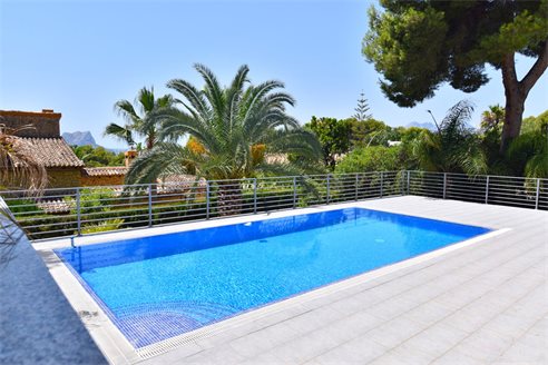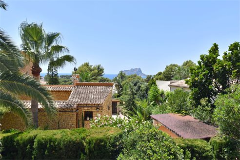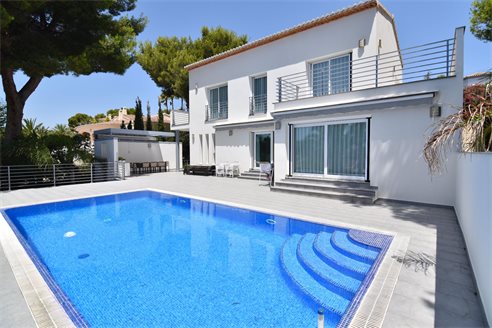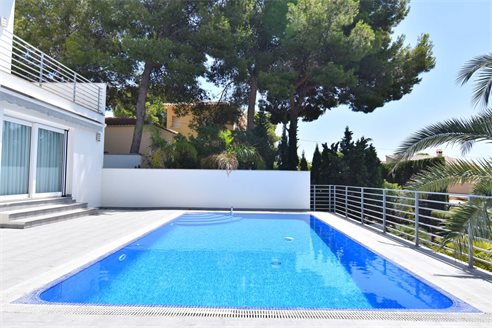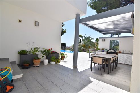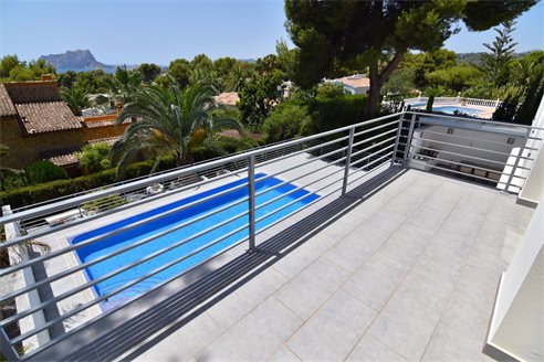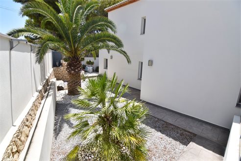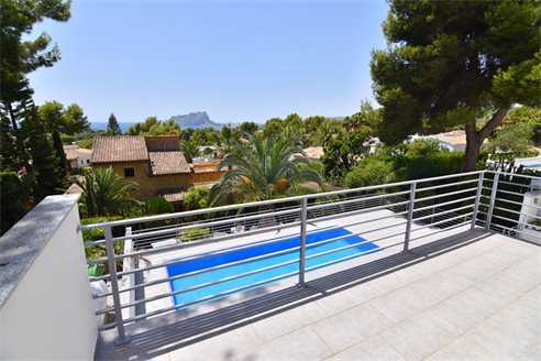 A 4 bedroom villa in Moraira, Costa Blanca, with private pool and beautiful sea views, just 1 km from the beach. This modern style villa is built on a 759 sqm plot, in a family residential area in Moraira, Costa Blanca, just 1 km from Cala Punta Estrella and restaurants, 6.9 km from Mercadona, 10 km from Aldi and 5.4 km from Lidl supermarket. Alicante airport is 94 km away. The south-facing villa is built on two floors, connected by an internal staircase. The lower floor consists of 1 living-dining room with direct access to the pool area, 1 fully equipped open kitchen and 1 toilet. The upper floor consists of 4 bedrooms with access to the terrace with fantastic Mediterranean views and 4 en-suite bathrooms, one with bath and the others with shower, sink and w.c. The house is equipped with an air conditioning, security windows, gas central heating and fitted wardrobes. Outdoors, you can enjoy a 8x4 private pool, summer kitchen, sauna with shower, storage room, covered parking for 3 cars and a beautiful garden with palm trees.