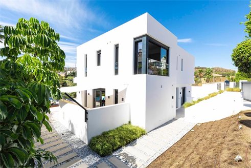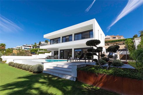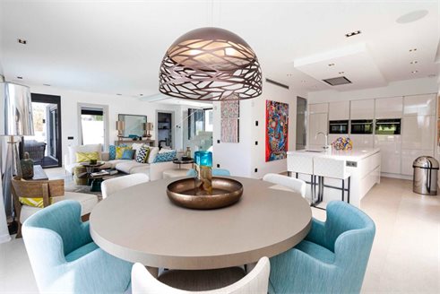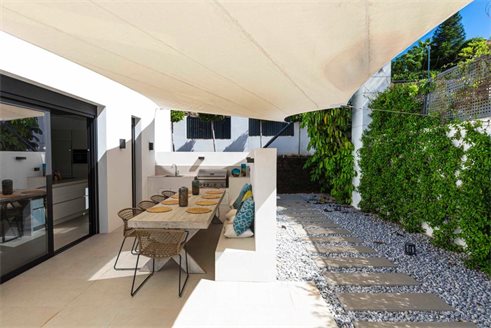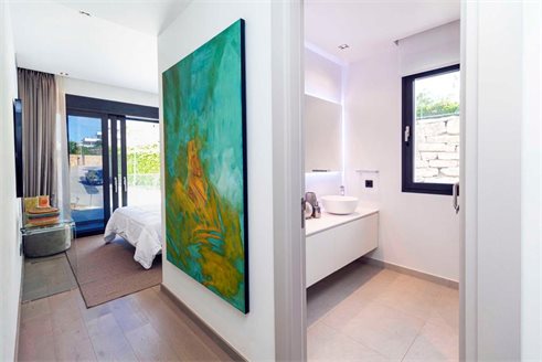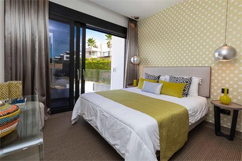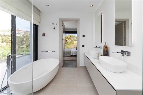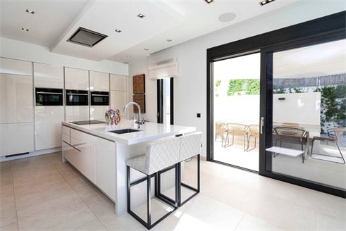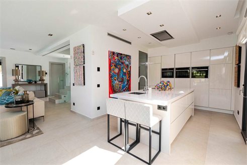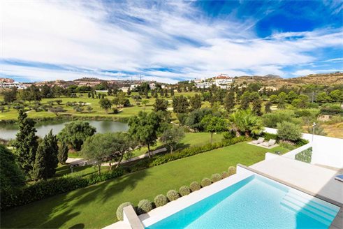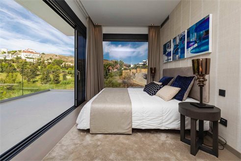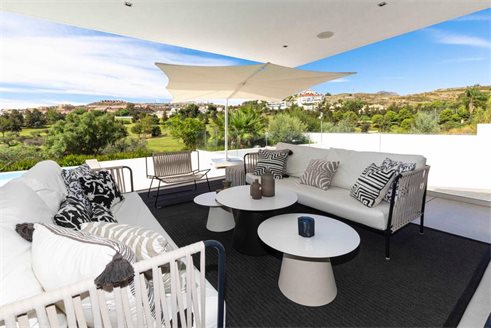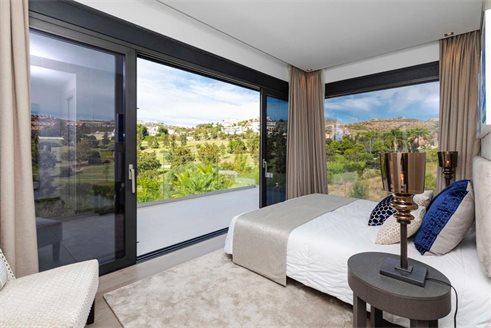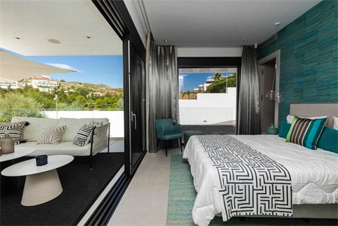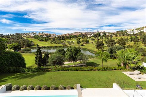 The main living area is open plan with the lounge, dining and kitchen all opening out onto the terrace, pool and garden area. The modern high quality kitchen with top range appliances has an island with breakfast bar and leads out to the chic barbecue area where you find a table that seats 10 people comfortably and covered with a sail style awning. Also on the ground floor you have an office and a guest suite that also opens out to the terrace and pool area. The upper floor hosts the master bedroom suite, another guest suite and a further 2 bedrooms that share a bathroom. The master bedroom and 2 more of the guest bedrooms open onto the upper terrace where you can enjoy the most beautiful views over the golf course.