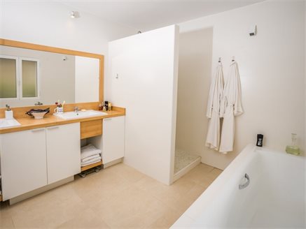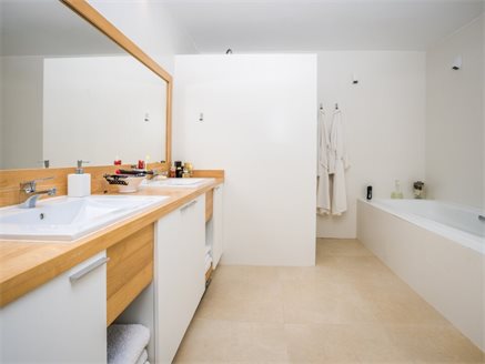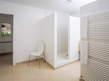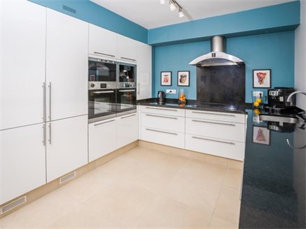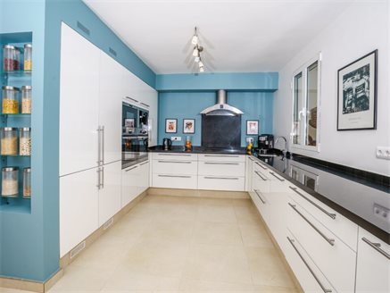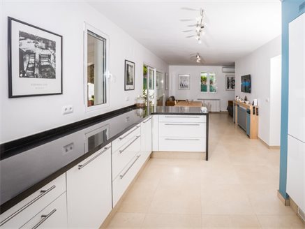 Built over 2 floors, the ground floor comprises: a large terrace with a covered area (pergola) with a dining table and lounging area, a fabulous, newly reformed, high- end, modern kitchen and dining room, an office that could be used as an extra bedroom, a guest toilet, a utility room, a spacious living room with a log burner fireplace, a reception area and a fantastic, vast glazed naya with an extra dining and living area.