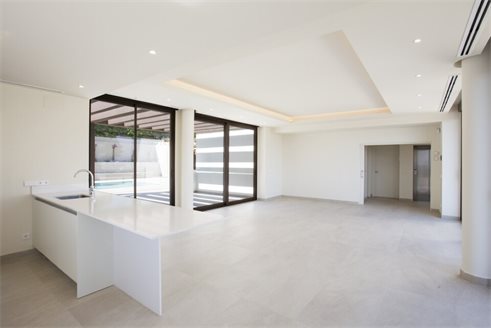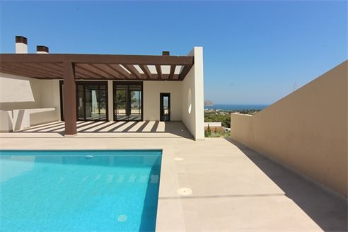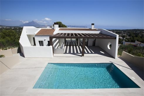 Beautiful modern style property, recently built, consisting of 4 bedrooms and 5 bathrooms, private pool and wonderful panoramic and sea views.The villa has several terraces to enjoy the time outdoors. All 4 bedrooms have their own bathrooms, built-in wardrobes, private balconies and the master even has its private terrace.Passing through the large living room - dining room, the open and fully equipped kitchen with an island, you enter directly onto a terrace with beautiful panoramic views of the Montgo mountain and the sea. On the other side of the house there is a spacious terrace with a private pool and a modern garden. From both sides of the house there are these wonderful views.The property has air conditioning hot - cold, underfloor heating, elevator, private parking for 3 cars, home automation control system, automatic irrigation system and alarm in the garden.