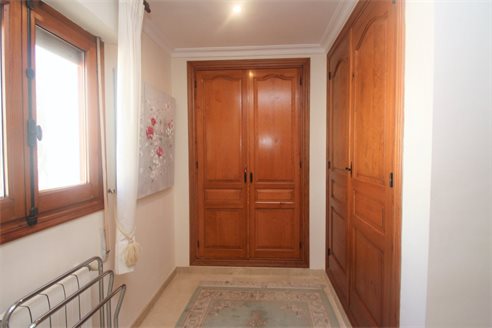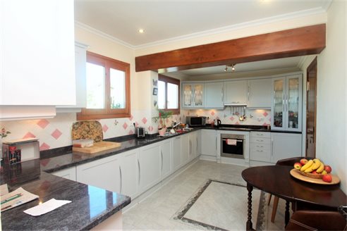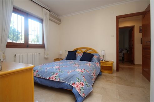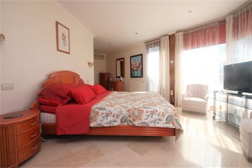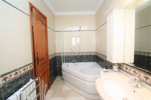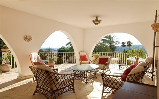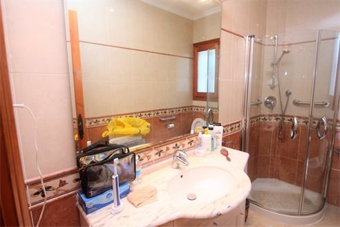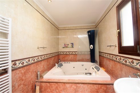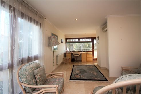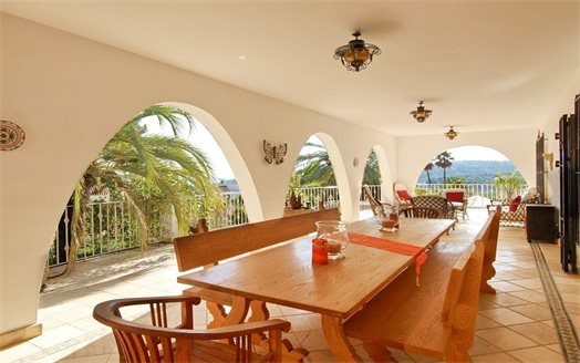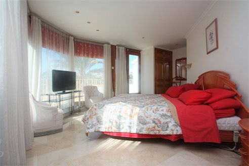 On the ground floor we have a spacious entrance hall, 3 bedrooms (15 m2 + 15 m2 + 12 m2), 3 bathrooms (2 en suite), a fully equipped separate kitchen and dining room, a living room of 50 m2 with access to a covered terrace of 60 m2. On the first floor we have the master bedroom of 20 m2 with an additional lounge of 20 m2, a dressing room, an en suite bathroom (10 m2) with Jacuzzi, a separate toilet and a terrace of 40 m2. There is also a large basement with a double garage of 40 m2m, a bathroom and 2 storage rooms of 8 m2 and 10 m2. This villa was built in 2002 and is in perfect condition. Equipped with central heating (upstairs also with underfloor heating), and air conditioning (hot and cold). It benefits from a spacious outdoor terrace with a 14x6 meter swimming pool. We also have a 15 m2 covered terrace with a barbecue next to the kitchen. The villa has 2 separate entrances for cars and plenty of parking spaces and enjoys very nice open views of the sea (south facing) all day long.