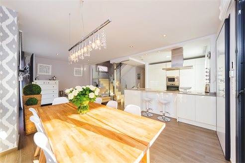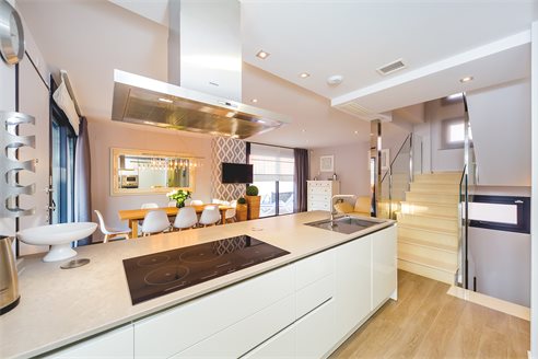 Detached villa in Aguas Nuevas, Torrevieja. The property consists of 250m2 plot and large private pool. Inside the property we will find a dining-living room with large windows to maximize the natural light. Also has an american kitchen, 1 bedroom and 1 bathroom. On first floor you will find 2 bedrooms, 1 bathrooms, terrace of 57m2 and private solárium of 44m2. Also has a basement with spacious living room, 2 bedrooms and 1 bathroom. The property has a contemporary style and was built with high quality materials.